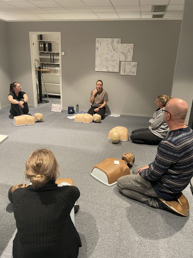 Deltagarna tränar praktiskt på moderna HLR-dockor med feedback och får varsin docka för bästa träning.
